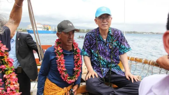 21 августа гавайцы прибыли в Паго-Паго (Американское Самоа) и там на «Хоку» сменили парусное вооружение — традиционную так называемую «клешню краба» на одной из мачт заменили обычным косым парусом. Оттуда сильный ветер и рассвирепевшее море не пускали их в Апиа, где должна была начаться конференция ООН, посвященная развитию малых островов, и лишь 30 августа, невзирая на четырехметровые волны, Найноа сумел вывести лодки из гавани. Он сам вел каноэ, ориентируясь по луне и звездам, и вывел его точно к цели! Гавайцы успели на конференцию, и Томсон с Пан Ги Муном подписали на борту «Хокулеа» декларацию об охране окружающей среды и морских ресурсов. Генеральный секретарь самолично стоял у рулевого весла во время показательного плавания по бухте и выразил надежду на встречу с полинезийцами в 2016 году, когда их каноэ прибудут в Нью-Йорк.