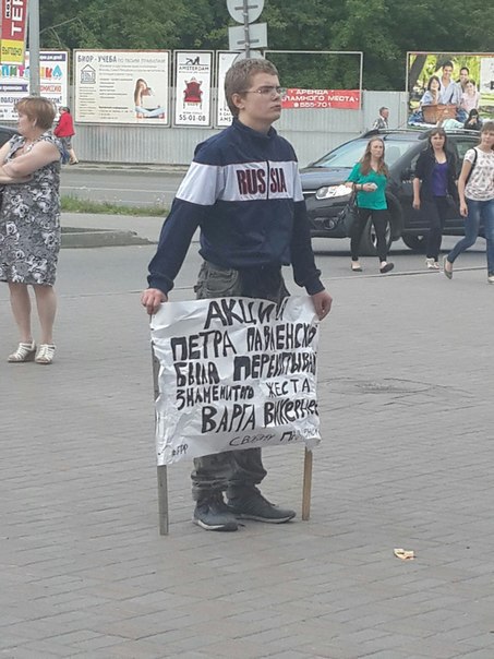 – Я все придумал и сделал сам. Моя акция называлась F.P.P.(аббревиатура от Free Peter Pavlensky). Прохожие реагировали по-разному, в основном удивлялись.Там было много гопоты, один уродец кричал на меня матом минут двадцать. Некоторые подходили и фотографировались. Пожилая пара на протяжении всей акции стояла рядом со мной. Старуха один раз подошла ко мне и сказала: "Ты, дурак, один в поле не воин". Дед периодически орал во все горло: "Смотрите, люди, он с оппозиционными плакатами стоит!" Я это все игнорировал.