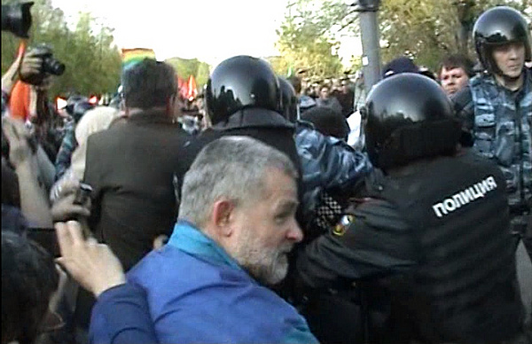 Анатолий Леонин на Болотной. На заднем плане полицейские уносят Ивана Непомнящих.