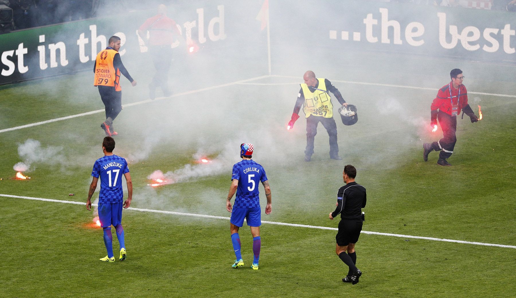 Фото: Max Rossi / Reuters / Scanpix / LETA Матч между сборными Хорватии и Чехии был остановлен из-за потасовки фанатов на хорватской трибуне и из-за того, что на поле полетели файеры. В это время счет был 2:1 в пользу Хорватии. Сразу после того как матч продолжился, чехи сравняли счет.