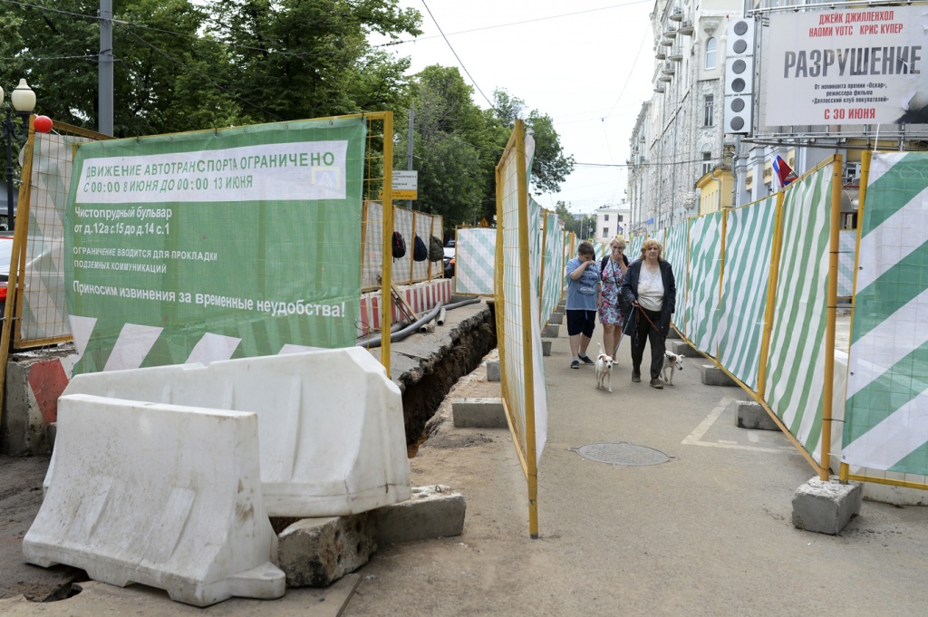 Чистопрудный бульвар. Работы, начатые на Бульварном кольце в конце апреля, ведет ООО «Спецстрой» — бюджет 4,6 млрд руб.