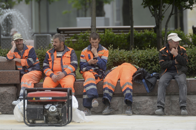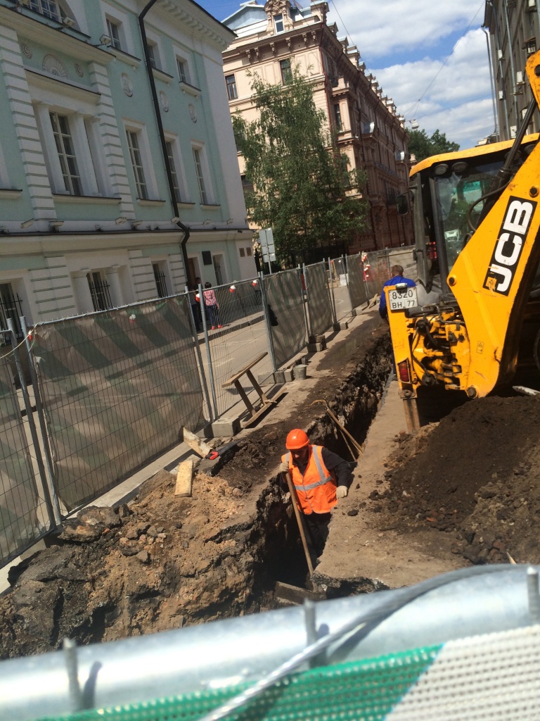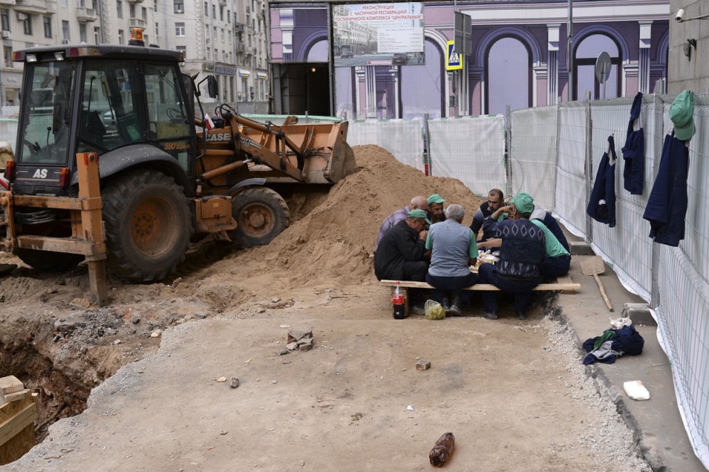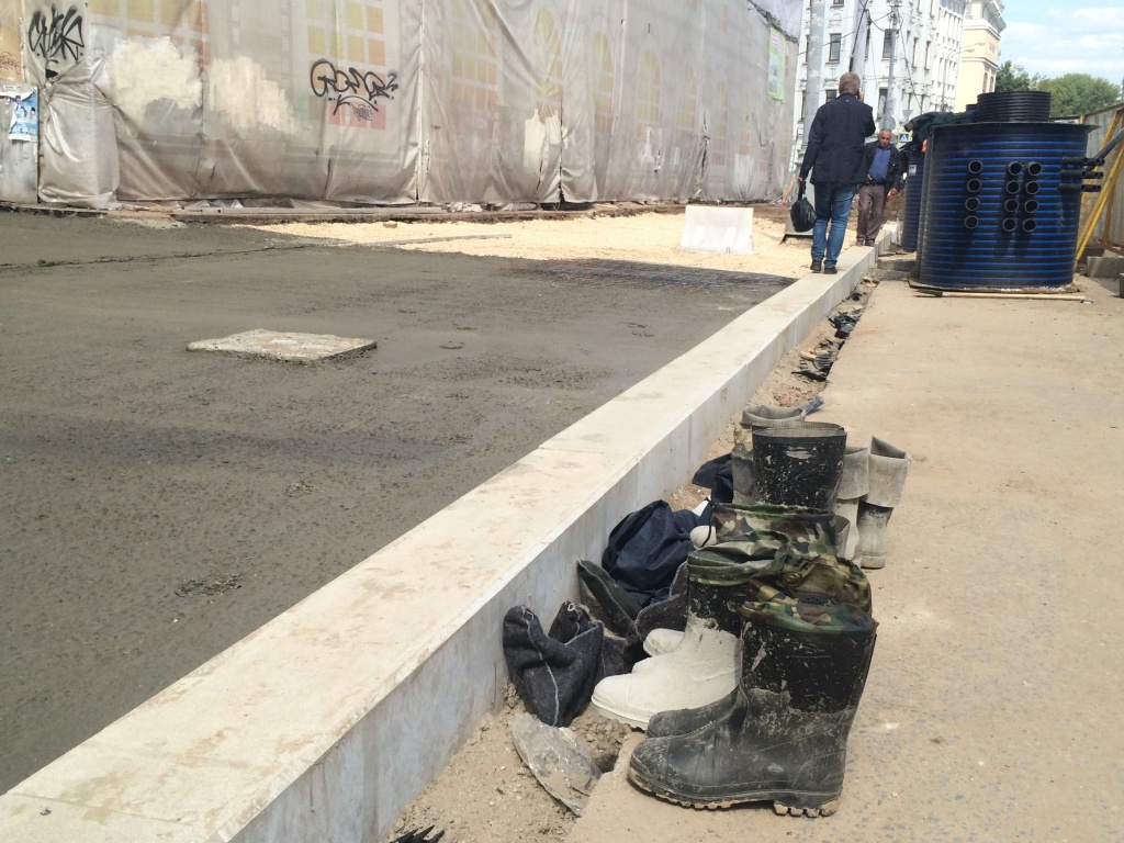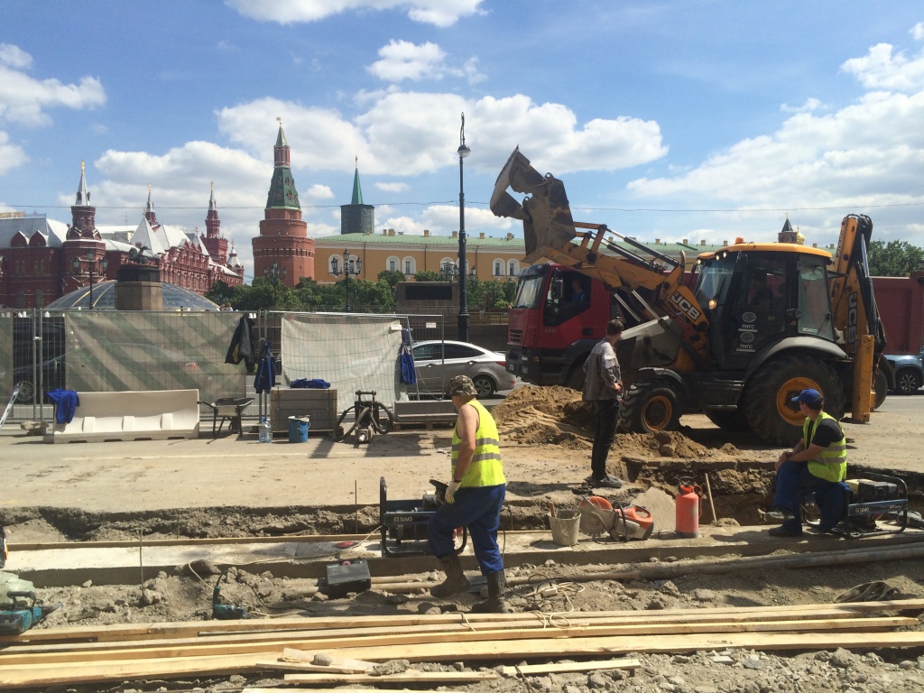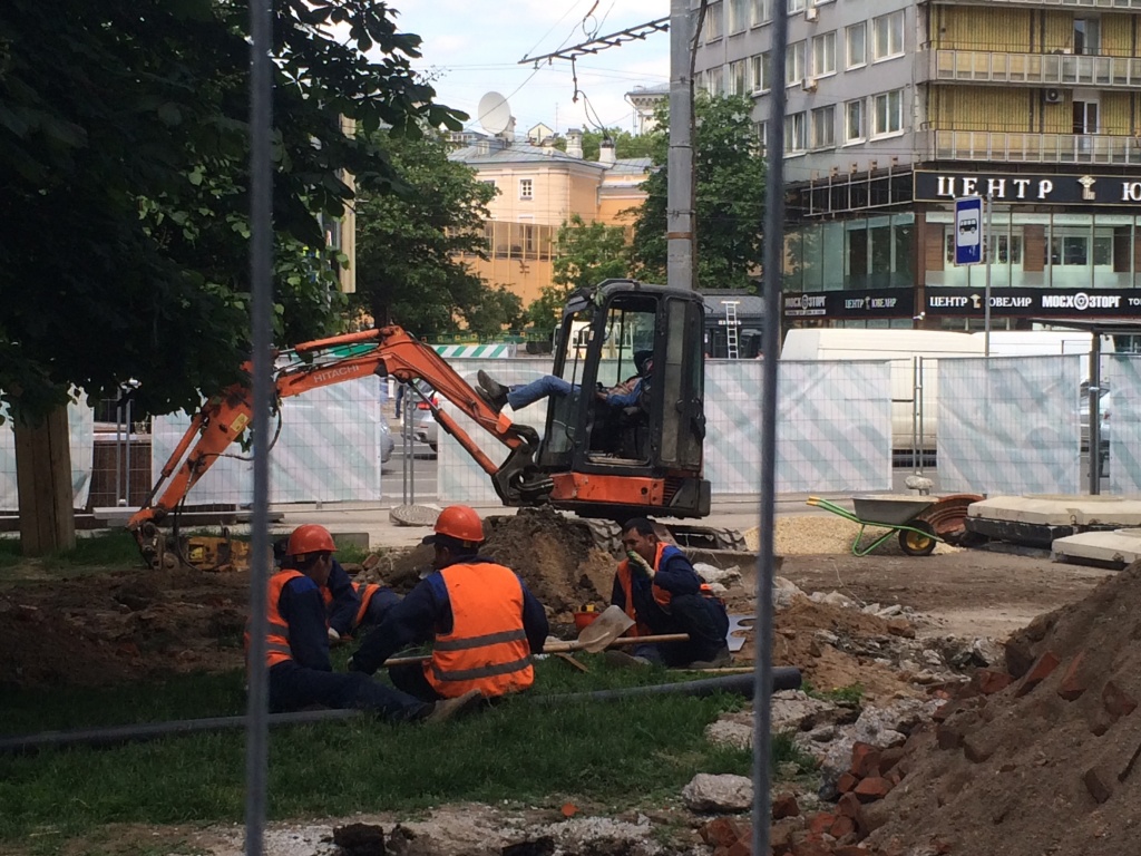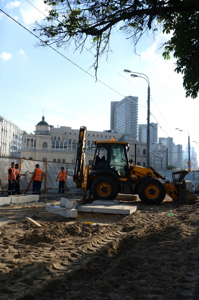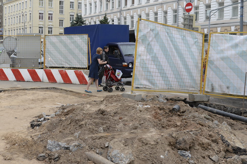 Столица оскаливается взломанным асфальтом, встречает автомобилистов перекрытыми полосами движения, а пешеходов — превращенными в сплошную линию окопов тротуарами. Сотни единиц строительной техники, тысячи разноголосых рабочих, выламывающих старую и укладывающих новую плитку. На оживленных магистралях они лопатами закидывают бетонный раствор прямо под ноги прохожим. Бригадир одного из участков советует местным жителям: «Уезжайте отсюда. Как минимум до осени». Работы проводятся по программе правительства Москвы «Моя улица»