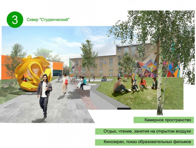Сквер "Студенческий" – там будет неформальная обстановка, здесь будут проходить студенческие обряды, можно будет смотреть образовательные фильмы в летнем кинотеатре».