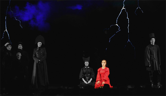 Все они в черном. Черные люди. Персонажи средневекового мифа. Только Борис — из другой оперы, именно из оперы, другой миф русской культуры: любовник-баритон в золотом цилиндре из пушкинских сюжетов. И, по контрасту в красном, Катерина, тоже другая, образ, лубочный в облике и речи, заканчивает роль долгим фольклорным радостным плачем, переходом в светлый мир. Все приведены к некоторой мифологической цельности, мир разделен на очень злое и очень доброе. Во всех есть внутренняя жизнь, хотя и не в формах реалистических персонажей.