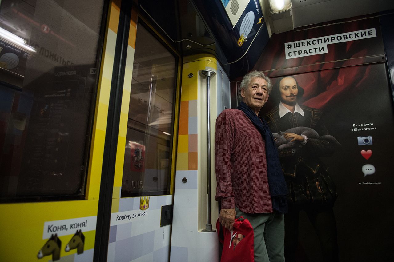 Британский актер Иэн МакКеллен прокатился в московском метро на поезде, посвященном «Шекспировским страстям». Тематический состав запустили в рамках проекта «Поэзия в метро» 24 мая на Филевской линии столичного метрополитена.