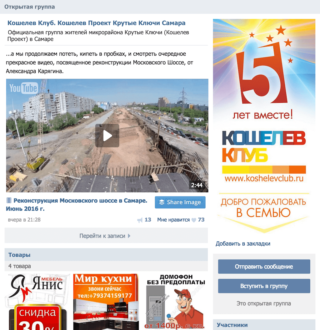 В Самаре новый микрорайон «Крутые Ключи» объединил всех жителей в сообщество «Кошелев-проект» с 27 тысячами подписчиков в ВКонтакте.