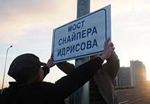 В Петербурге активисты "Солидарности" "переименовали" мост имени Ахмата Кадырова, закрепив у въездов таблички с надписью "Мост снайпера Идрисова". Как пишет Фонтанка.Ру, по мнению активистов, улицы и мосты Петербурга следует называть именами героев, принесших городу всенародную славу.