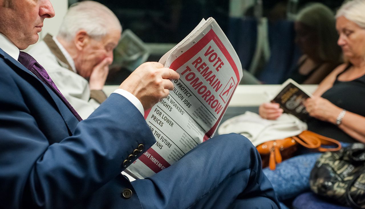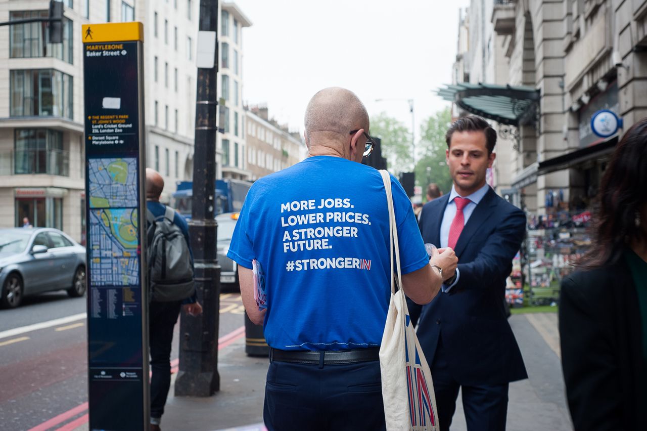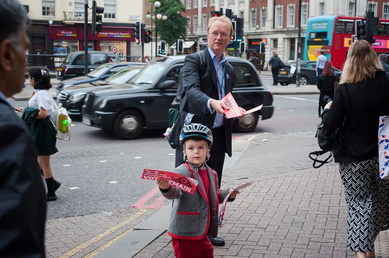 На выходе из метро Baker Street в Лондоне к спешащим на работу прохожим подбегает четырехлетний мальчик и протягивает листовки: «Не забудьте завтра проголосовать». Его папа, стоящий рядом с наклейками «Iʼm in» («Я остаюсь»), добавляет: «Голосуйте, чтобы остаться». Старшая дочь лет десяти помогает отрывать стикеры и клеит их желающим на пиджаки. Седовласый мужчина останавливает ее жест улыбкой: «Прости, милая, но я из другого лагеря!»