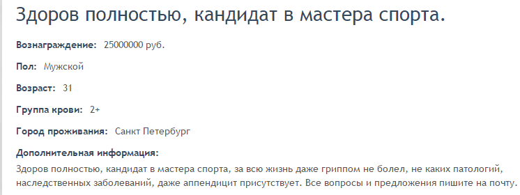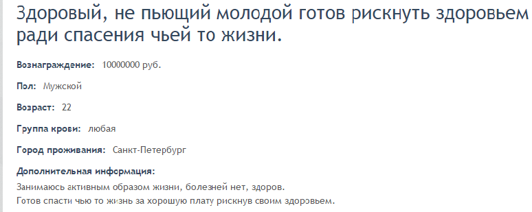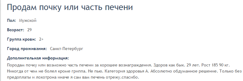 На сайтах вроде база-доноров.рф есть объявления не только доноров, но и покупателей. В отличие от продавцов они не оставляют номера телефонов, а предпочитают общаться по почте. Иногда даже оставляют объявления не под именами, а подписываясь названиями реально существующих медицинских центров — например, «Юнион клиник». Однако в справочной центра заверили, что пересадками органов клиника не занимается. Представившись потенциальным донором, корреспондент «Бумаги» связался практически со всеми покупателями с тематических сайтов. Спустя несколько часов пришло два ответа. Первый покупатель предложил операцию в Петербурге и 50–65 тысяч долларов, однако сначала попросил заплатить 10 тысяч рублей за «обследование в клинике». Правда, сразу предупредил, что, несмотря на это, никаких гарантий заключения сделки дать не может. «Кроме почки, больше ничего ценного не нашлось, а на обычной работе много не заработаешь»Второй покупатель пообещал 33 миллиона рублей и настаивал на операции в Израиле. «Не верьте людям, которые пишут, что можно всё сделать в России! Это всё ложь или черный рынок. Вас обманут, возьмут кредиты, заберут документы. Или вырежут лишние органы», — предупреждал мужчина, представившийся работником клиники трансплантологии в Израиле. На ответное письмо с вопросом, нужны ли какие-то финансовые гарантии от донора, житель Израиля не ответил и больше на связь не выходил. «В интернете один лохотрон», — утверждает 29-летний Олег. Мужчина полгода жил в машине и, как он рассказывает, питался «Дошираком», но за это время нашел только одного реального покупателя. Правда, сделка всё равно сорвалась. Татьяна, которая копит на бар и новую квартиру, тоже за два года никак не продвинулась. Реальные покупатели на нее так и не вышли. Более того, ни у кого из опрошенных «Бумагой» продавцов дело не дошло даже до предоперационного медицинского обследования. «Большинство людей, обратившихся за помощью к посредникам, были обмануты мошенниками, которые просили предоплату и исчезали», — рассказывает 24-летний бармен Ларион. Он решил продать почку, чтобы выплатить долг в 150 тысяч и тоже купить квартиру: «Больше ничего ценного не нашлось, а на обычной работе много не заработаешь».