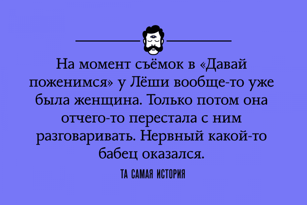 Но тут так получилось, что зазнакомилась я совершенно случайно с мальчиком (которого стоит называть скорее дядей), который ходил на телепередачу «Давай поженимся». Каюсь, пару раз мы с матушкой на даче смотрели это постановочное сватание на Первом канале и всё задавались наперебой вопросом — ну кто же туда пойдёт, нет, ну кем надо быть, чтобы туда пойти? Какой нормальный человек на всю страну скажет: «Я прошерстил все бары, сайты знакомств и соседок — ничего не получилось. Лариса, спасай!». И вот, судьба предоставила мне ходячий ответ.