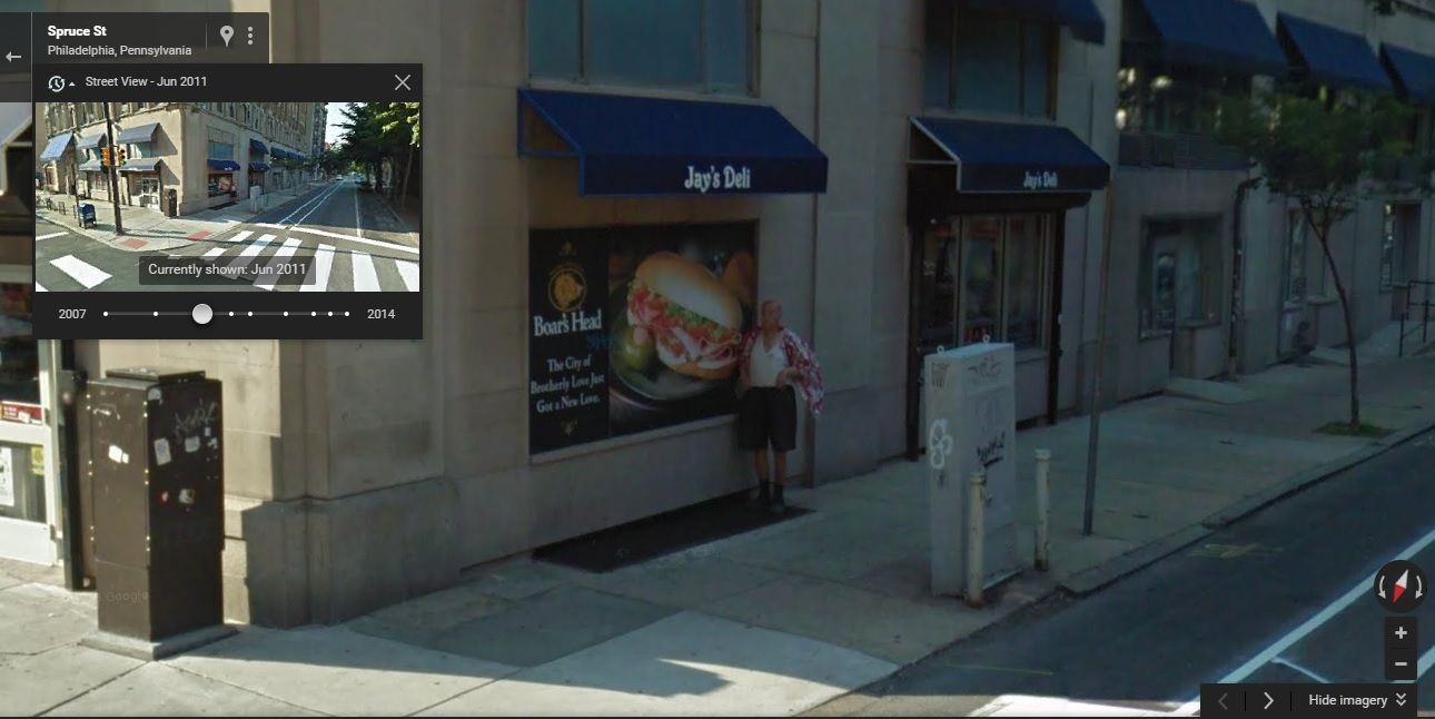 Мужчина даже дважды попал на панорамные снимки Google Street View. В мае 2014 года: