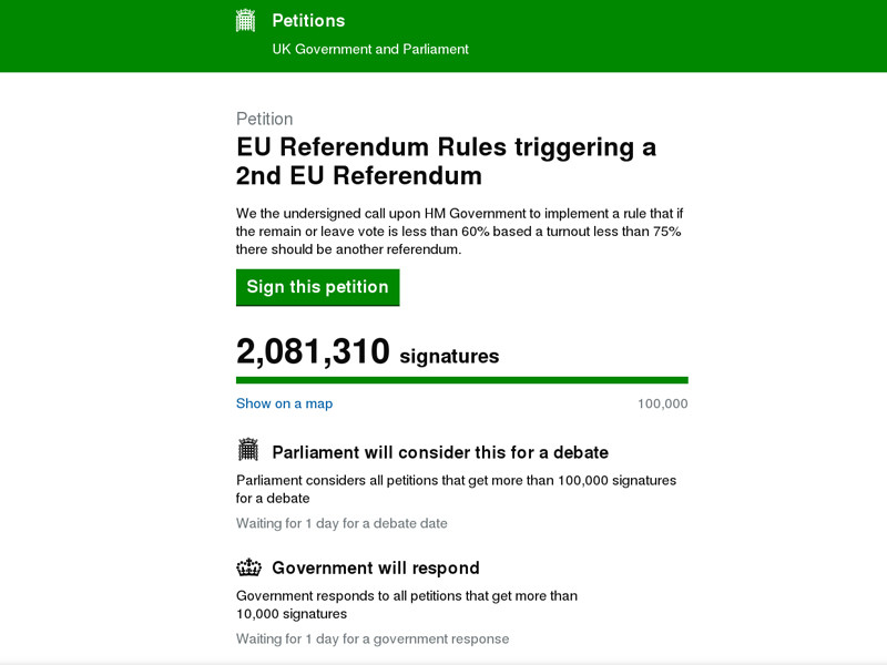 Британская петиция с просьбой о втором референдуме по выходу страны из Европейского Союза набрала 2 млн подписей за сутки. По данным на 20:33 мск. ее подписали 2 млн 32 тысячи человек.
