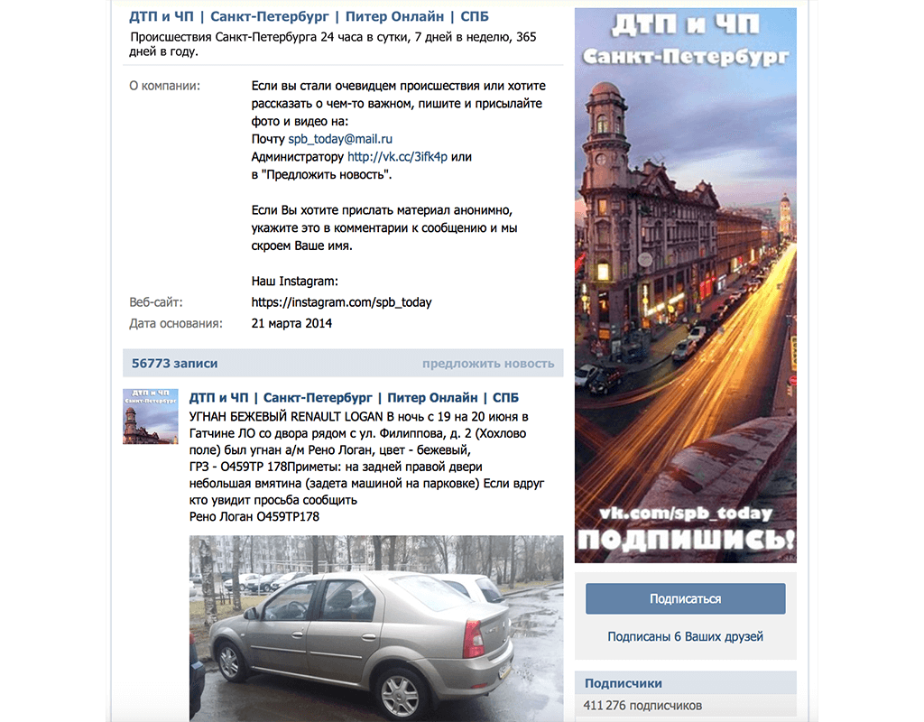 «ДТП и ЧП» – группа ВКонтакте, появившаяся в марте 2014 года и насчитывающая более 400 тысяч подписчиков. В группе публикуется информация о происшествиях в Санкт-Петербурге из первых рук – участники, которые хотят поделиться какой-либо новостью, пишут в группу и присылают фото и видео с места происшествия.