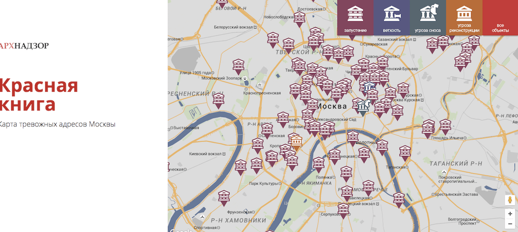 Движение «Архнадзор» выпустило «Красную книгу» – веб-проект, посвященный московским памятникам архитектуры, которые находятся под угрозой разрушения. «Красная книга» представляет собой каталог объектов культурного наследия, нанесенных на карту города.