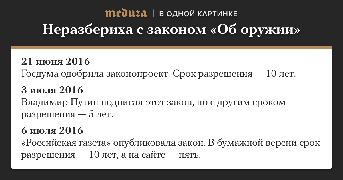 Дата06.07.2016АвторСкрытИсточникМедузаСохранённая копияInternet ArchiveOriginal MaterialShow translationНеразбериха с законом «Об оружии» вышла на новый уровень. В одной картинкеФото в анонсе: Валерий Матицын / ТАСС / Scanpix / LETA Подробно про странности в публикации «РГ» — здесь.