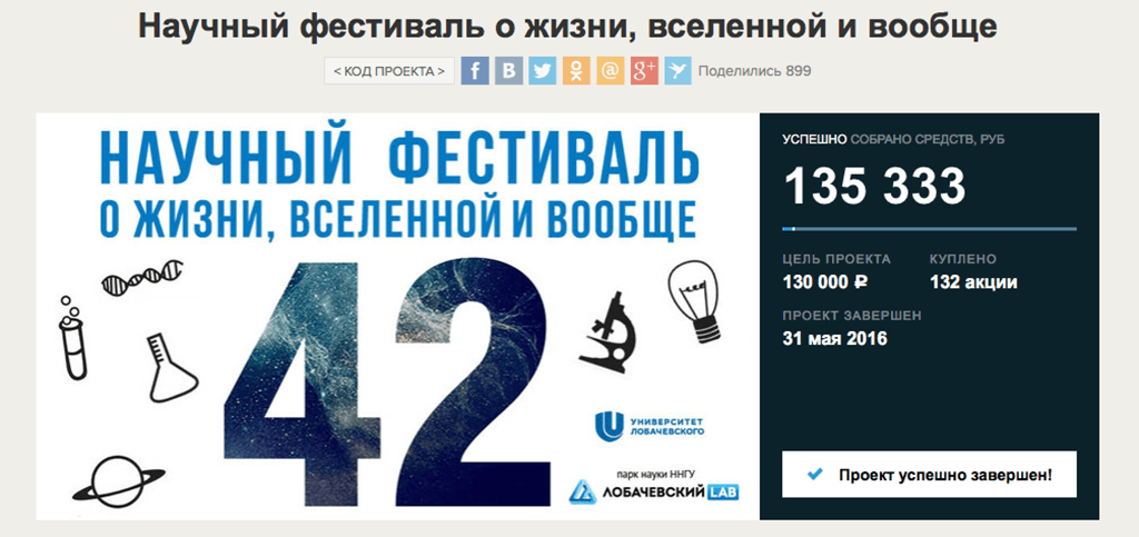 Весной 2016 года проект «42: фестиваль о науке, жизни, Вселенной и вообще» за 45 дней собрал на платформе Planeta.ru 135 тысяч 333 рубля. В итоге 18 июня 2016 года фестиваль успешно прошел.