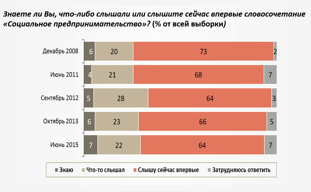 - Российское общество не имеет представления о социальном предпринимательстве. В опросе исследовательской группы ЦИРКОН был вопрос «Знаете ли вы, что-либо слышали или впервые слышите сейчас словосочетание «Социальное предпринимательство»?». С 2008 года количество жителей России, ответивших «Знаю», увеличилось всего лишь с 6 до 7 процентов. Исследователи отмечают, что для изменения ситуации необходима серьезная информационная поддержка социального предпринимательства, массовый показ образцов бизнес-практик, формирование позитивного образа социального предпринимателя.