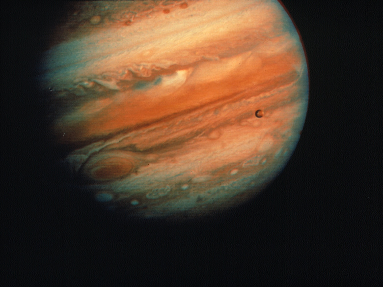 Юпитер прекрасно виден с Земли невооруженным глазом и в периоды противостояния уступает по яркости на ночном небе только Луне и Венере, хотя его орбита и расположена на расстоянии, в пять раз большем от Солнца, чем земная. Причина – в огромных размерах. Диаметр Юпитера в 11 раз больше, чем у Земли; масса больше в 317 раз; объем – более чем в 1300 раз. Вдобавок у него выше, чем у Земли, отражающая способность.