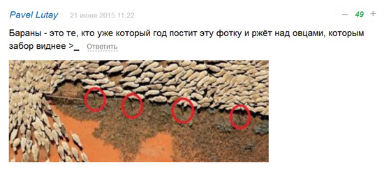 Картинку усердно шерили, намекая на тупость интернет-толпы. Но чем больше что-то распространяется, тем больше глаз смотрит и тем больше подмечает. Вирусный редактор в конце концов пригляделся и увидел там столбы, на которых, вероятно, натянута проволока. А если так, то у баранов действительно нет другого пути, кроме как протискиваться в ворота.