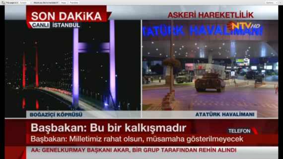 Одновременно в Стамбуле захвачены здания государственного телевидения TRT. На сайте военных TSK появляется информация, что поскольку демократии в Турции больше нет, военные забирают ее себе. Одновременно этот текст заставляют произнести ведущую с TRT (я так поняла, на NTV ее показывают без звука).