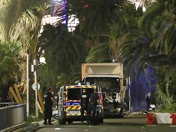 Полиция рядом с грузовиком террориста. Ницца, 14 июля 2016. Фото: Zendan Gizy Сообщалось, что грузовик двигался зигзагами, и окружающие поначалу подумали, что водителю стало плохо за рулем. Таким образом машина проехала около двух километров, прежде чем остановилась. Тогда водитель вышел из кабины и начал стрелять.