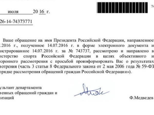 В письме за подписью консультанта кремлевского департамента письменных обращений граждан и организаций Ф. Медведева говорится, что обращение подписантов петиции направлено в «Министерство спорта Российской Федерации в целях объективного и всестороннего рассмотрения».