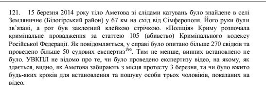 Управление Верховного комиссара ООН по правам человека в своем докладе рассматривает убийство крымскотатарского активиста Решата Аметова, как предполагаемую казнь без надлежащего судебного разбирательства. Об этом 15 июля сообщила «Крымская правозащитная группа».