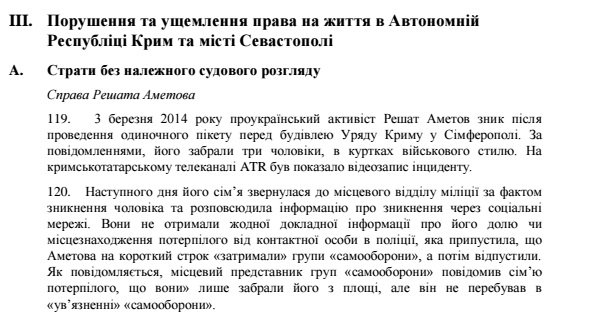 «В Автономной Республике Крым и городе Севастополе, статус которых определен резолюцией 68/262 Генеральной Ассамблеи ООН о территориальной целостности Украины, УВКПЧ зафиксировало как минимум одну предполагаемую казнь без надлежащего судебного разбирательства», — пишет Управление верховного комиссара.