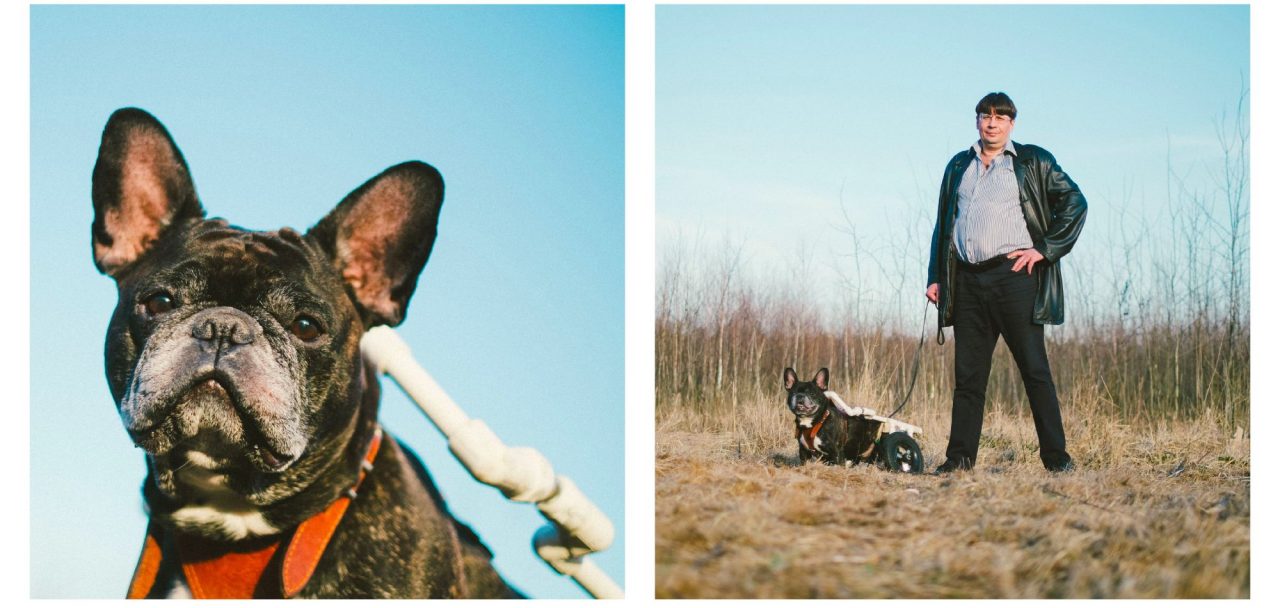 Андрей и французский бульдог МаксФото: Мария Ионова-Грибина для ТД Коляску мы сами сделали, там ничего сложного. Сварили полиэтиленовые трубы, которые для отопления идут, плюс два колеса от детской коляски. Я в Интернете посмотрел схемы и по ним соорудил. У Макса в шесть лет была межпозвоночная грыжа, и задние ноги отказали. Уже два года так живем. Но на коляске мы гуляем не часто, только когда идти далеко, или на улице слякоть и грязь. А так мы стараемся на подвеске гулять с ним, на ходунках, иначе он совсем про задние лапы забывает.