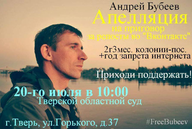 20 июля в 10:00 в Тверском областном суде (Тверь, ул. Горького, 37) состоится рассмотрение апелляционной жалобы на приговор блогеру Андрею Бубееву.
