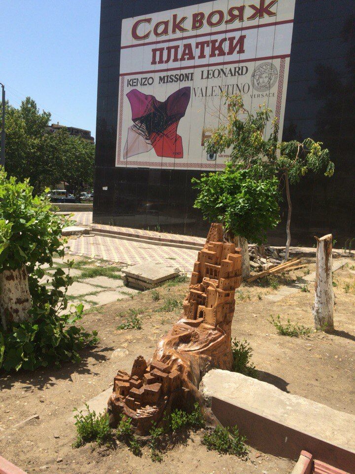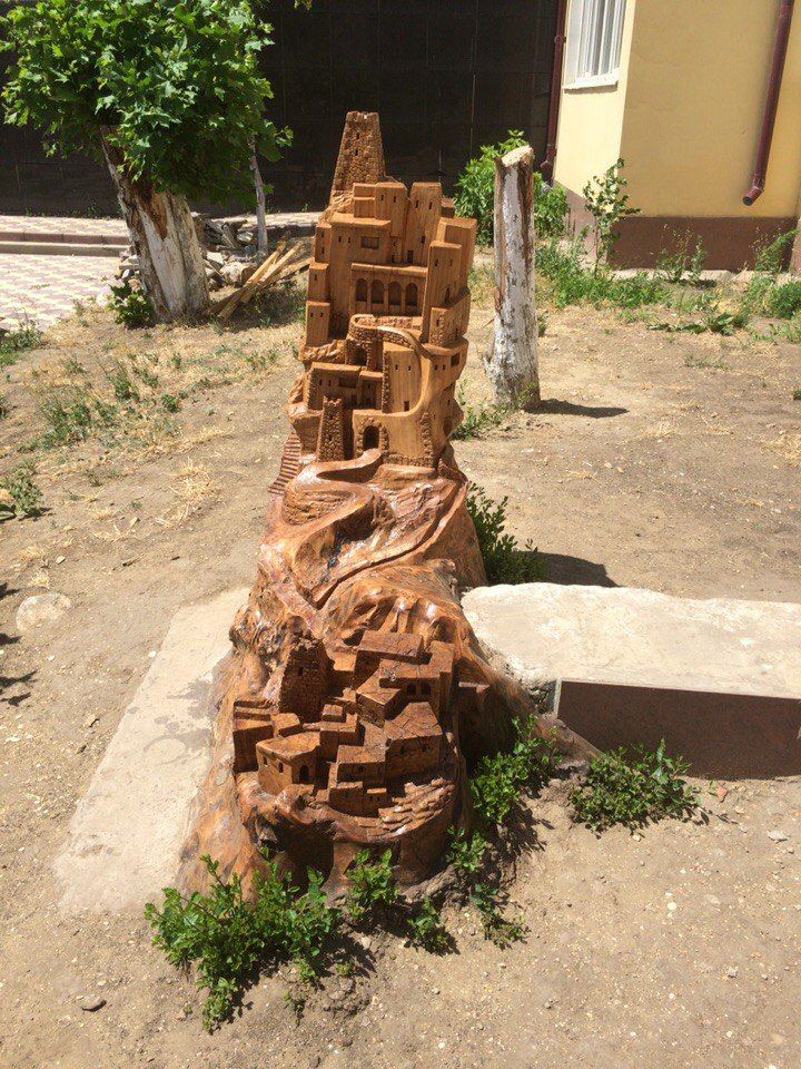 В центре Махачкалы неизвестный мастер вырезал из пня горное село. Он детально изобразил дома, дороги и башни, как будто возведенные на скале. Декорированный пень заметил местный житель Аскер Сотавов.