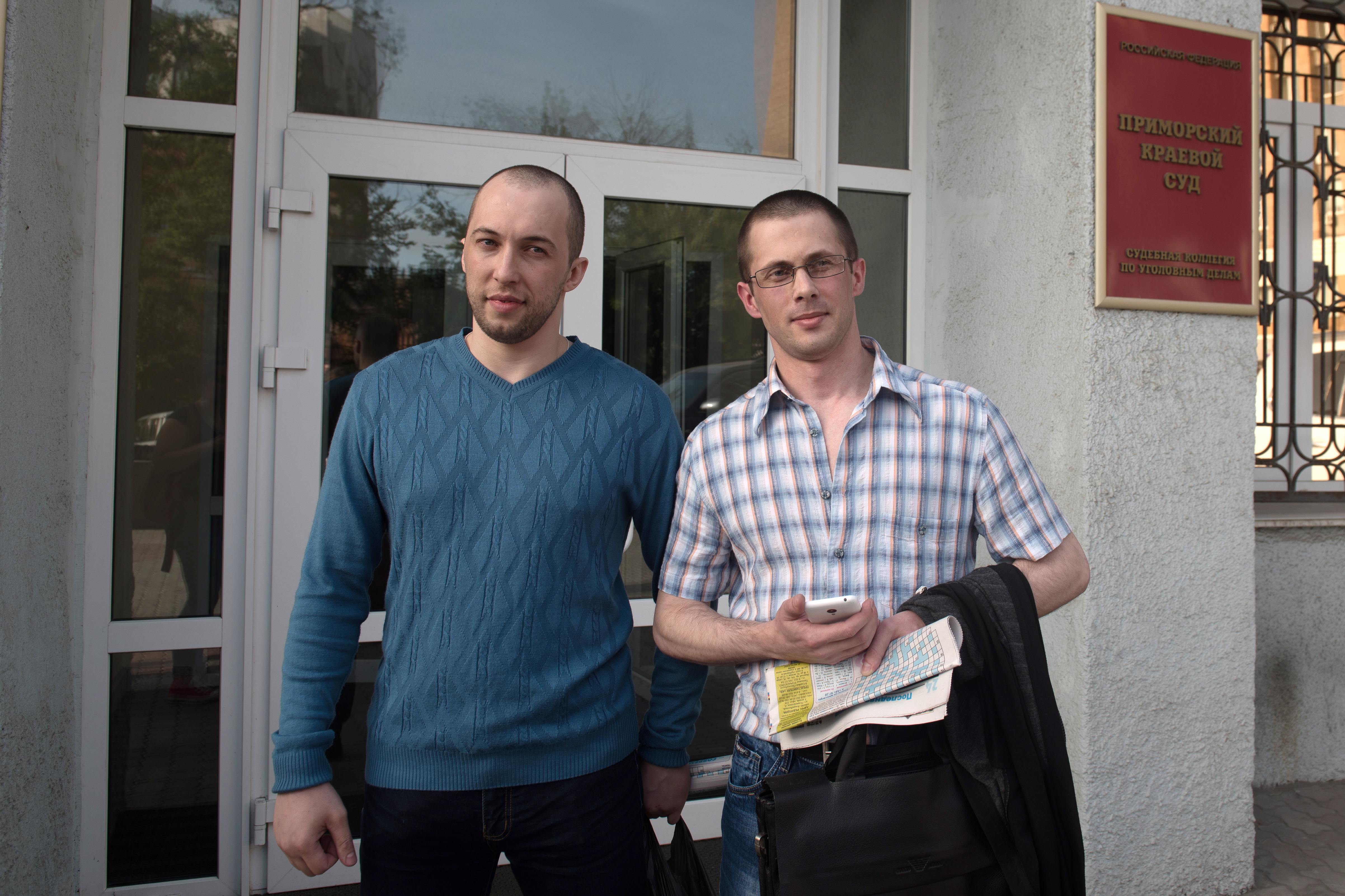 Фигуранты дела «приморских партизан» Вадим Ковтун и Алексей Никитин(слева направо), освобожденные в зале суда после оправдательного вердикта присяжных,