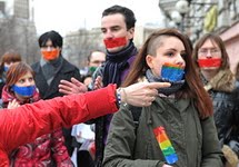 6 апреля около 50 человек несколькими группами прошли по московским улицам с заклеенными ртами в знак протеста против гомофобного насилия и замалчивания проблем ЛГБТ (