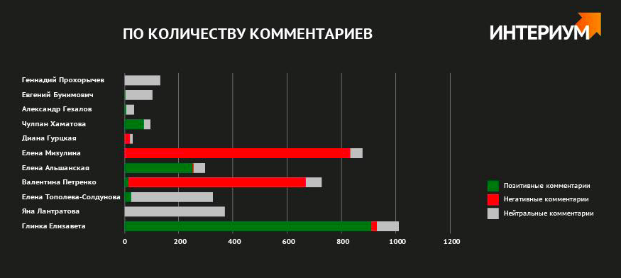 Инфографика: «Интериум» «Глинка является самым обсуждаемым кандидатом — можно встретить больше тысячи упоминаний. В соцсетях множество комментариев в ее поддержку: «Она — идеальный детский защитник», «Доктор Лиза — лучший вариант!», «Давайте всем миром ее уговаривать!» и другие. Но даже при таком позитивном настрое со стороны людей назначение Глинки находится под вопросом. Обсуждается отказ Глинки от должности омбудсмена из-за войны в Донбассе», — говорится в исследовании.