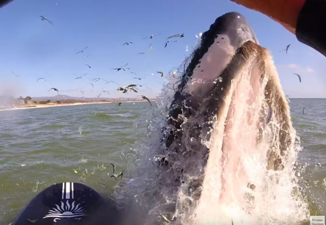 В Калифорнии кит выпрыгнул из воды рядом с плавающей на доске девушкой.
