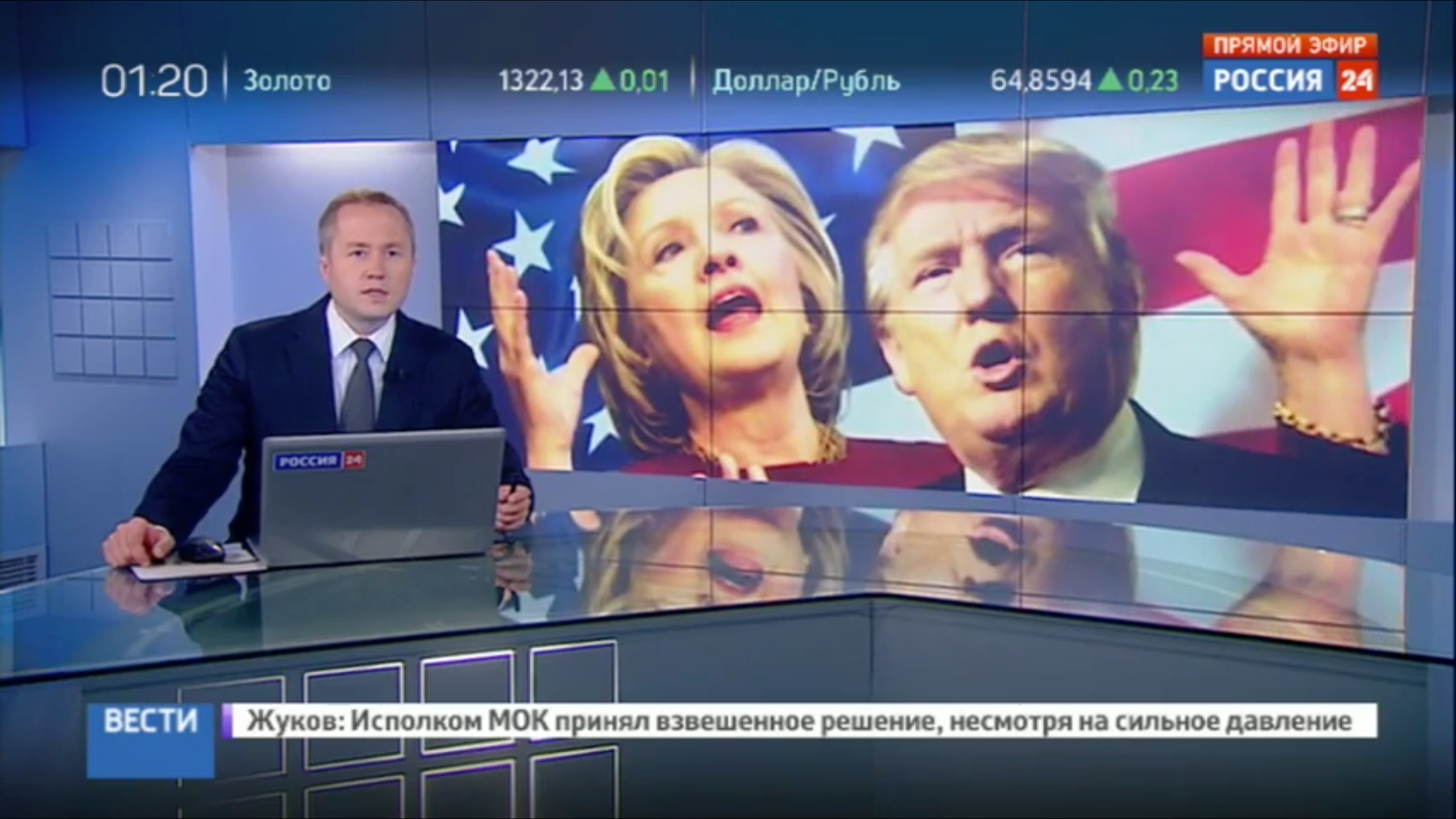 According to the agency “Medialogiya,” Rossiya 24 (formerly known as Vesti) is far and away the most cited television news network in Russia, attracting twice as many citations as the runner up, another state-controlled station, Channel One. On the front page of Rossiya 24's website, at the time of this writing (when it is evening in Moscow on Monday, July 25), there is only one news report about Trump or Clinton: a short story about Trump overtaking Clinton in national polls by five percent.