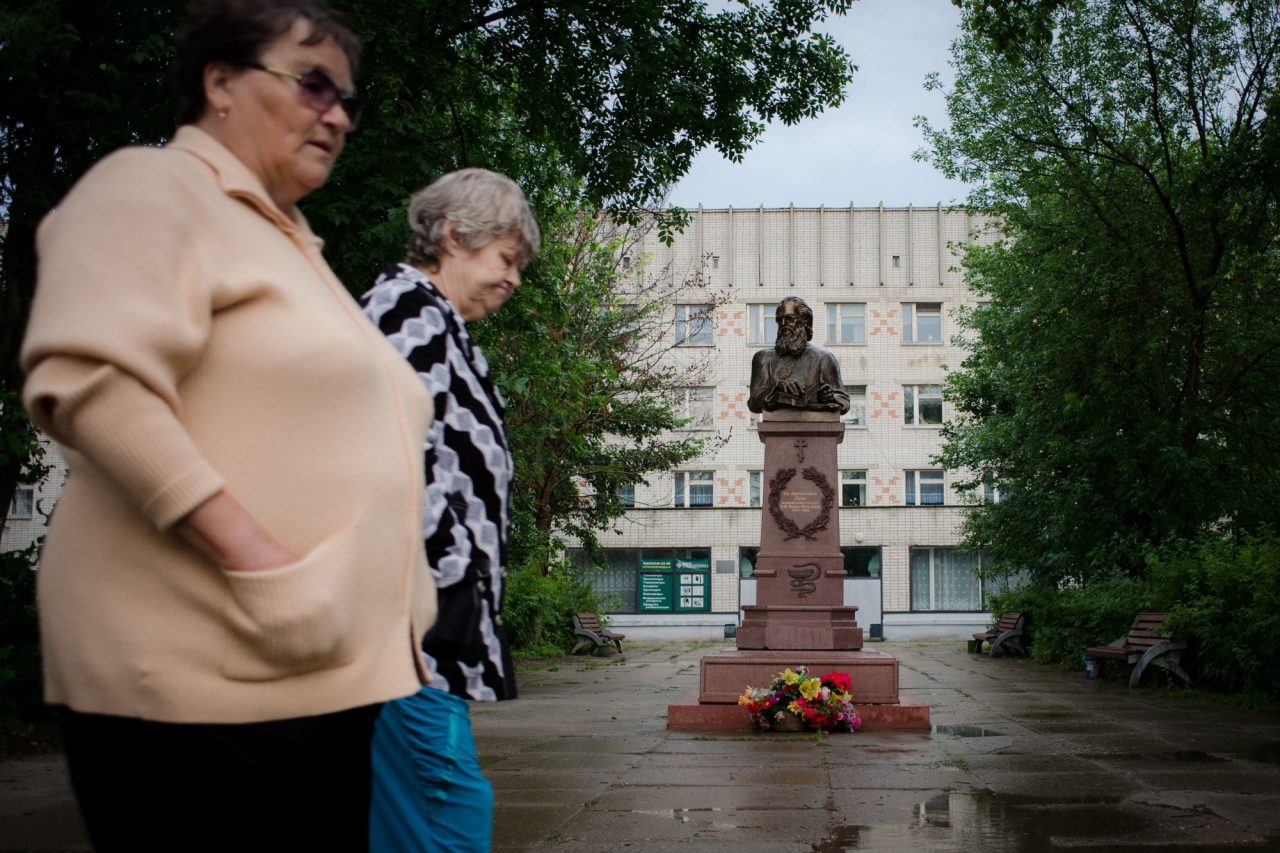 Памятник сельскому врачу Луке. Его поставили пару лет тому назад перед поликлиникой, где Валентин Николаевич проработал 27 лет.Фото: Стоян Васев для ТД Ее голос звучит так уверенно, что кажется, что операция, которая будет совсем скоро, пройдет хорошо, что язвы на ноге у Валентина Николаевича исчезнут, что деньги на лекарства найдутся, что все депутаты выстроятся в очередь на узкой лестнице перед их квартирой, а Надежда Ивановна всех простит и угостит пельменями.