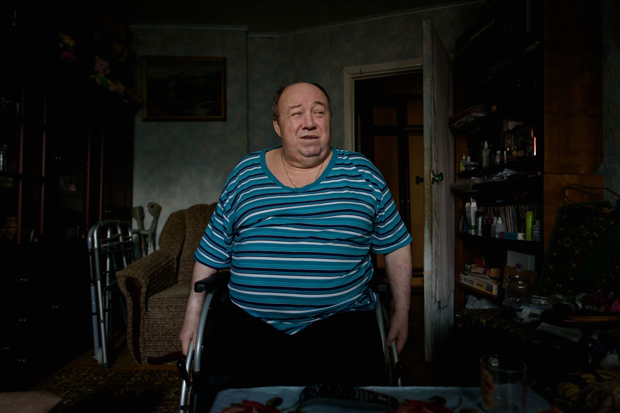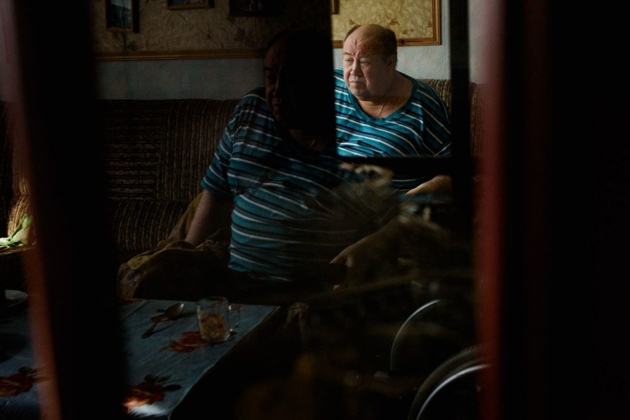 Вместо левой голени у Валентина Николаевича пустая штанина с лампасами. Ногу ампутировали три года назад из-за тромбов, спровоцированных сахарным диабетом. Вторую ногу, на которой тоже начали появляться язвы, Валентин Николаевич то и дело заботливо переставляет с кресла на пол, чтобы разгонять кровь. Он постоянно трет глаза, говорит редко, только чтобы поправить жену или пошутить. Сам же смеется над шутками, расплываясь в улыбке.