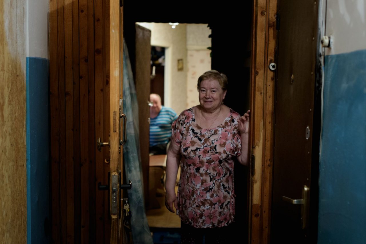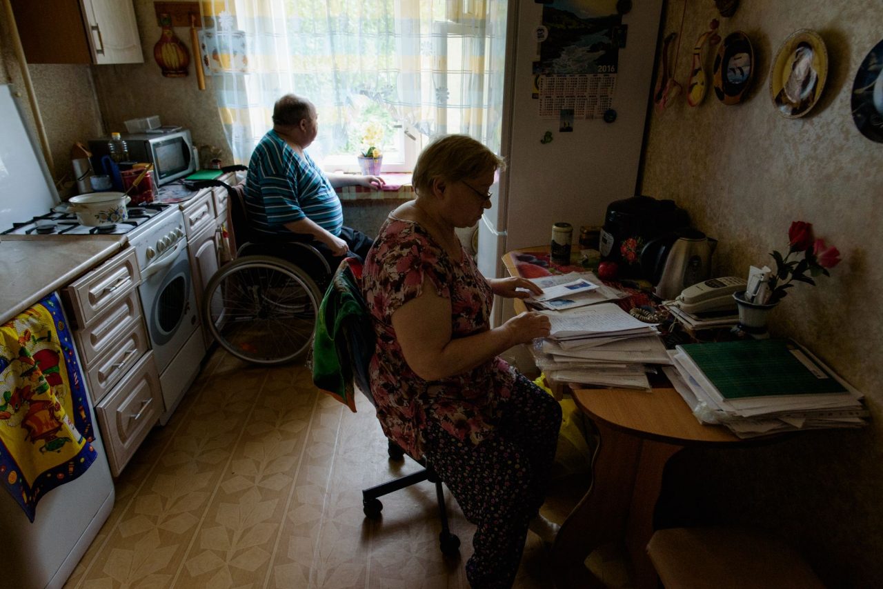 В подъезде. «Лифта нет, спуститься на коляске нельзя без помощи сына и зятя. Поэтому Валя почти не выходит»Фото: Стоян Васев для ТД Надежда Ивановна слишком часто произносит слова «выбивать» и «воевать», и эти слова совсем не идут тихой женщине со спокойным голосом.