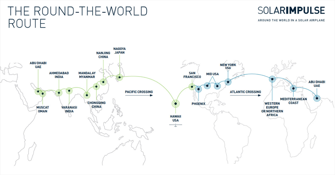 Фото: Solar Impulse Карта полета Solar Impulse 2. Путешествие началось в ОАЭ (самая левая точка на карте) и прошло через Индию, Китай, Японию, США и Европу.Фото: Solar Impulse Швейцарские пилоты Бертран Пиккар и Андре Боршберг начинают кругосветный полет самолета Solar Impulse 2. Абу-Даби, 9 марта 2015 годаФото: Solar Impulse Начало первого полета Solar Impulse 2. Абу-Даби, 9 марта 2015 годаФото: Solar Impulse Полет над городом Маскат, Оман. 10 марта 2015 годаФото: Solar Impulse Solar Impulse 2 улетает из города Мандалай, Мьянма. 30 марта 2015 годаФото: Solar Impulse Самолет на солнечных батареях приземляется на Гавайях. 28 июня 2015 годаФото: Solar Impulse Пилот Solar Impulse 2 Андре Боршберг за штурвалом самолета. 28 июня 2015 годаФото: Solar Impulse Бертран Пиккар и Андре Боршберг готовятся вылететь с Гавайев. 5 апреля 2016 годаФото: Solar Impulse Solar Impulse 2 совершает полет над ГавайямиФото: Solar Impulse Гавайи, 21 апреля 2016 годаФото: Solar Impulse Solar Impulse 2 летит из Гавайев в Сан-Франциско. 21 апреля 2016 годаФото: Jean Revillard / Solar Impulse Самолет на солнечных батареях над мостом Золотые Ворота, Сан-Франциско. 23 апреля 2016 годаФото: Solar Impulse Solar Impulse 2 над Сан-Франциско. 2 мая 2016 годаФото: Solar Impulse Пилотов Solar Impulse 2 приветствуют в Финиксе. 2 мая 2016 годаФото: Solar Impulse Отправление Solar Impulse 2 из Финикса. 12 мая 2016 годаФото: Solar Impulse Центр управления в Монако готовится к приземлению Бертрана Пиккара в городе Талса (штат Оклахома). 23 апреля 2016 годаФото: Solar Impulse Solar Impulse 2 в Талсе, Оклахома. 21 мая 2016 годаФото: Solar Impulse Приземление в Лехай Вэлли, штат Пенсильвания. 25 мая 2016 годаФото: Solar Impulse Отправление Solar Impulse 2 из Лехай Вэлли в Нью-Йорк. 10 июня 2016 годаФото: Solar Impulse Solar Impulse 2 над статуей Свободы в Нью-Йорке. 10 июня 2016 годаФото: Solar Impulse Solar Impulse 2 над статуей Свободы в Нью-Йорке. 10 июня 2016 годаФото: Solar Impulse Приземление самолета в Севилье, Испания. 23 июня 2016 годаФото: Solar Impulse Solar Impulse 2 над пилотажной группой испанских ВВС «Патрулья Агила». 23 июня 2016 годаФото: Solar Impulse Андре Боршберг. Отправление из Севильи в Каир. 11 июля 2016 годаФото: Solar Impulse 11 июля 2016 годаФото: Solar Impulse Solar Impulse 2 над египетскими пирамидами. Каир, 13 июля 2016 годаФото: Solar Impulse Приземление в Каире. 13 июля 2016 годаФото: Solar Impulse Бертран Пиккар готовится к финальному полету — из Каира в Абу-Даби. 23 июля 2016 годаФото: Solar Impulse Отправление из Каира. 23 июля 2016 годаФото: Solar ImpulseФото: Solar Impulse Бертран Пиккар делает селфи во время последнего полета. 26 июля 2016 годаФото: Solar Impulse Абу-Даби. 26 июля 2016 года