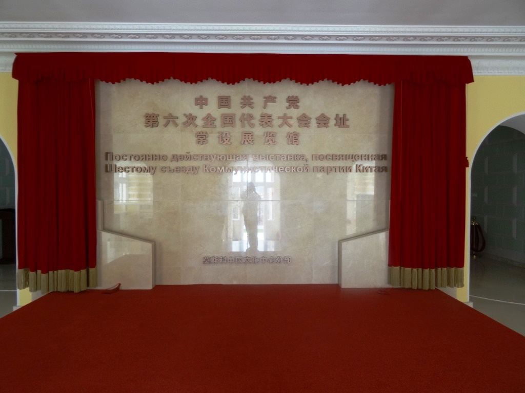 Экспозиция начинается на первом этаже с большой красивой надписи золотыми иероглифами и русским переводом "Постоянно действующая выставка, посвященная Шестому съезду коммунистической партии Китая". Надпись обрамлена красными портьерами. Широкая мраморная лестница ведет на второй этаж, где воссоздан интерьер зала заседаний Шестого съезда.