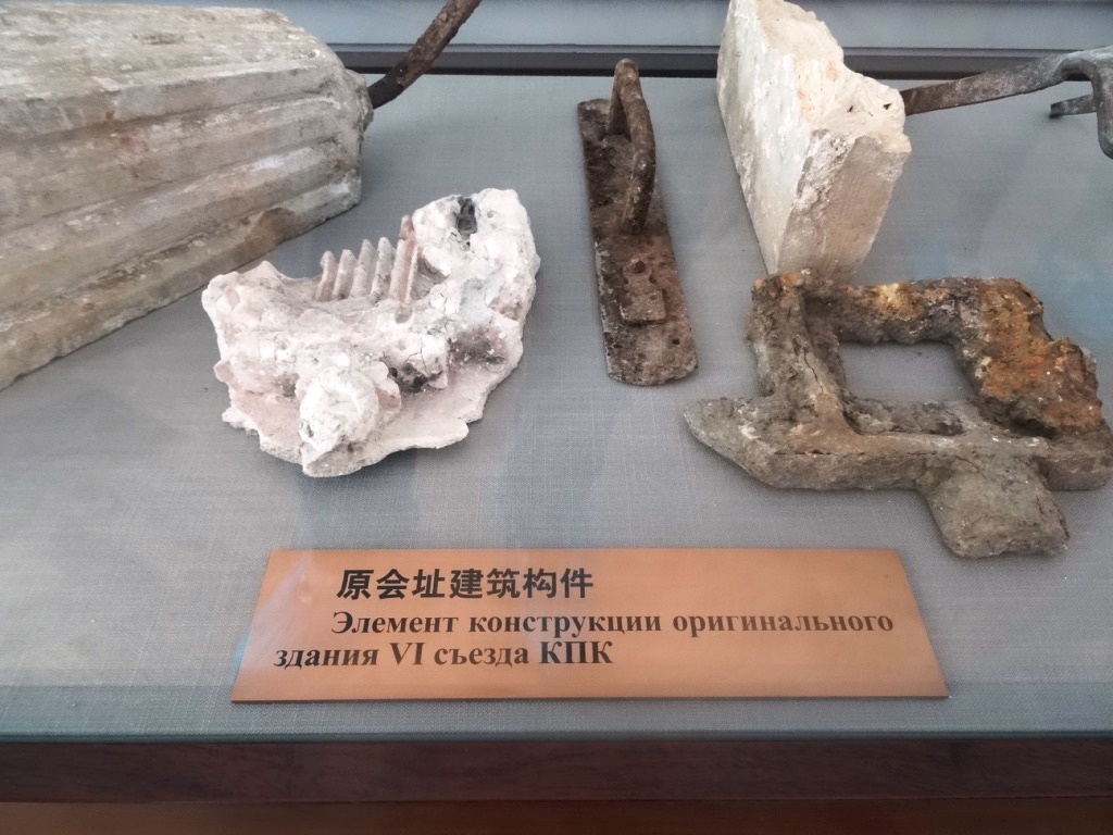 В боковой комнате стоят три стенда с краткой информацией о реконструкции Старо-Никольского. На китайский язык эта информация не переведена. Очевидно, что китайским посетителям музея она не интересна. У стены расположена небольшая витрина с историческими артефактами главного дома усадьбы: дверная ручка, фрагмент карниза, обломок балюстрады. Подпись на русском и китайском гласит "Элементы конструкции оригинального здания VI съезда КПК". Это все, что китайские музейщики сочли необходимым сообщить о двухсотлетней истории усадьбы.