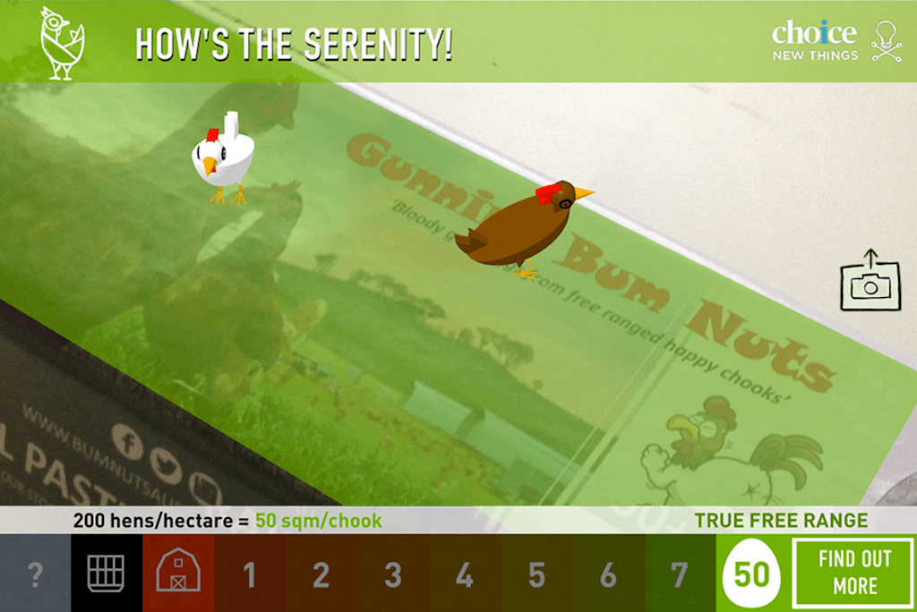 Для этой социальной кампании организация CHOICE New Things Lab создала мобильное приложение CluckAR с дополненной реальностью, которое визуально показывает, действительно ли куриные яйца в упаковке соответствуют плотности голов на свободном выгуле.