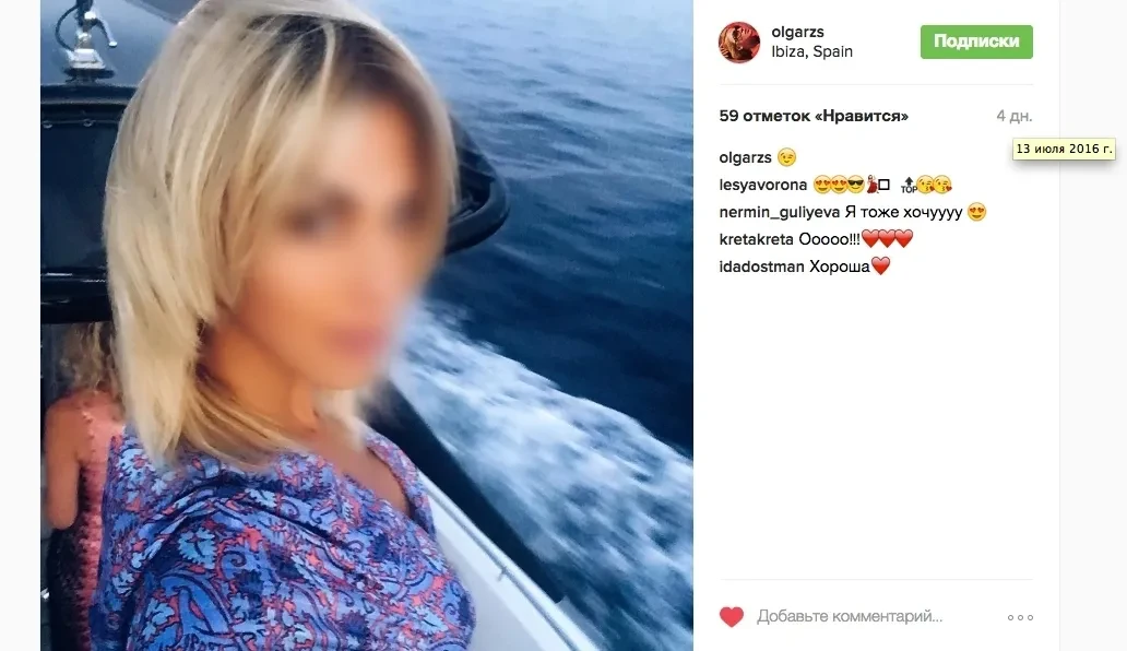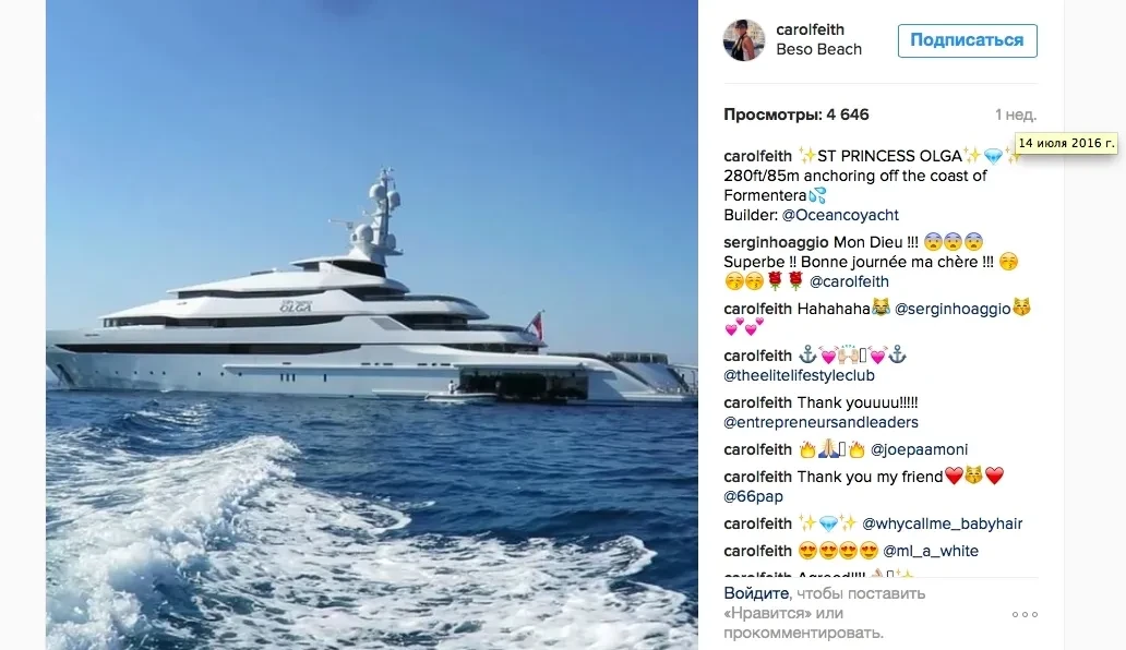 Всего нам удалось найти шесть безусловных совпадений по времени публикации и геотегам фотографий из социальных сетей супруги Игоря Сечина с маршрутом яхты. И эти совпадения происходили не в один год, а беспрерывно на протяжении последних трех лет. Более того, мы учитывали только те случаи, когда совпадало все — и время, и место. Но были примеры, когда совпадали геотег с фотографии и местонахождение лодки, а время различалось на несколько дней или неделю. Это может быть связано с тем, что Ольга Сечина публиковала фотографии в социальных сетях не сразу, а позднее.