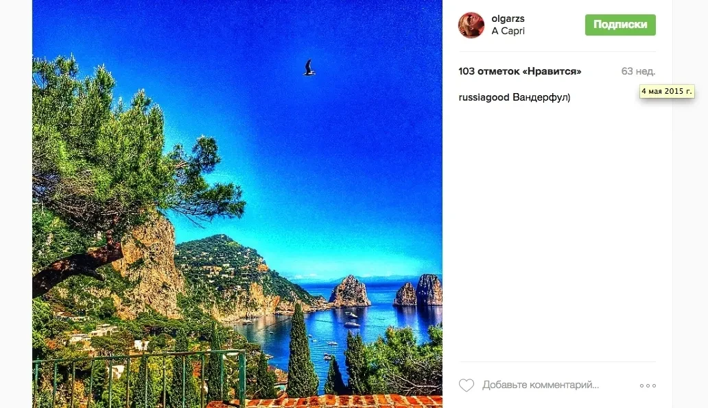 4 мая 2015 года Ольга Сечина выложила в Instagram фотографию с острова Капри (Фото 12). И снова в этот же день, 4 мая, система АИС показывала, что яхта St. Princess Olga находилась возле того же острова Капри (Фото 13).
