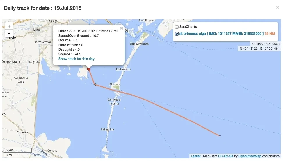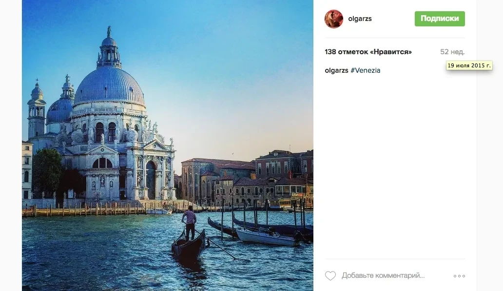 19 июля 2015 года жена руководителя «Роснефти» опубликовала фотографию из Венеции (Фото 10). По данным портала vesseltracker.com, отслеживающего движения судов, ровно в этот же день, 19 июля 2015 года, в порту Венеции находилась и яхта St. Princess Olga (Фото 11). (Порталы, подобные vesseltracker.com, используют в своей аналитике данные АИС — автоматической идентификационной системы, установленной на судах.)