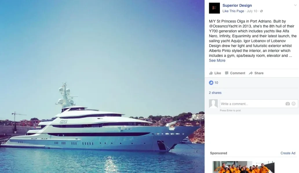 13 июля 2016 года Ольга Сечина опубликовала фотографию с моторной лодки с геотегом «Ибица, Испания» (Фото 7). За три дня до этого в Facebook компании Superior Design было опубликовано фото яхты St. Princess Olga из порта Адриано, что на Балеарских островах, рядом с Ибицей (Фото 8). 14 июля 2016 года, на следующий день после публикации Сечиной фотографии с Ибицы, пользователь Instagram @carolfeith, который катался в районе тех же Балеарских островов на моторной лодке, выложил видео яхты St. Princess Olga (Фото 9).