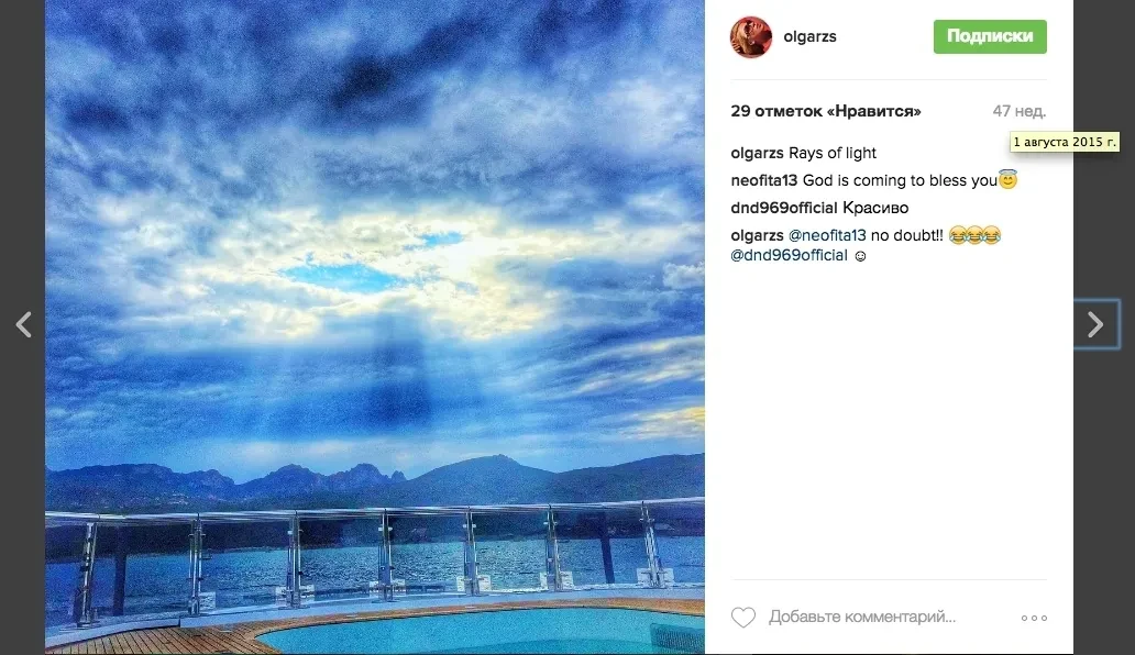 27 августа 2014 года Ольга Сечина опубликовала в Instagram фотографию с яхты, где она отдыхала с подругой возле круглого джакузи, окруженного белыми диванами (Фото 1). 5 июля 2015 года Сечина опубликовала фото (Фото 2), на котором она сидит на палубе возле бассейна. 1 августа того же года она разместила фотографию с той же палубы, у того же бассейна (Фото 3).