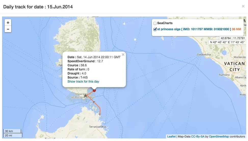 14 июня 2014 года Сечина опубликовала фотографию живописного скалистого берега (Фото 14). Ее подписчик в Instagram спросил по-итальянски: «Ты где?» «Корсика», — ответила Сечина. И вновь ровно в этот же день, по данным системы АИС, яхта St. Princess Olga находилась возле Корсики (Фото 15).