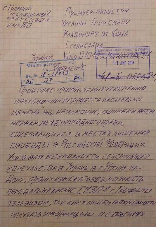 Украинец Станислав Клых, осужденный в Чечне к 20 годам строгого режима по сфабрикованному делу УНА-УНСО, обратился к премьер-министру своей страны Владимиру Гройсману с просьбой "принять меры к ускорению переговорного процесса касательно обмена лиц, незаконно, вопреки всем нормам международного права, содержащихся в местах лишения свободы в Российской Федерации". Факсимиле первой страницы письма, написанного Клыхом по-русски в камере № 80 грозненского СИЗО-1, опубликовал у себя в Фейсбуке замминистра юстиции Украины Сергей Петухов.